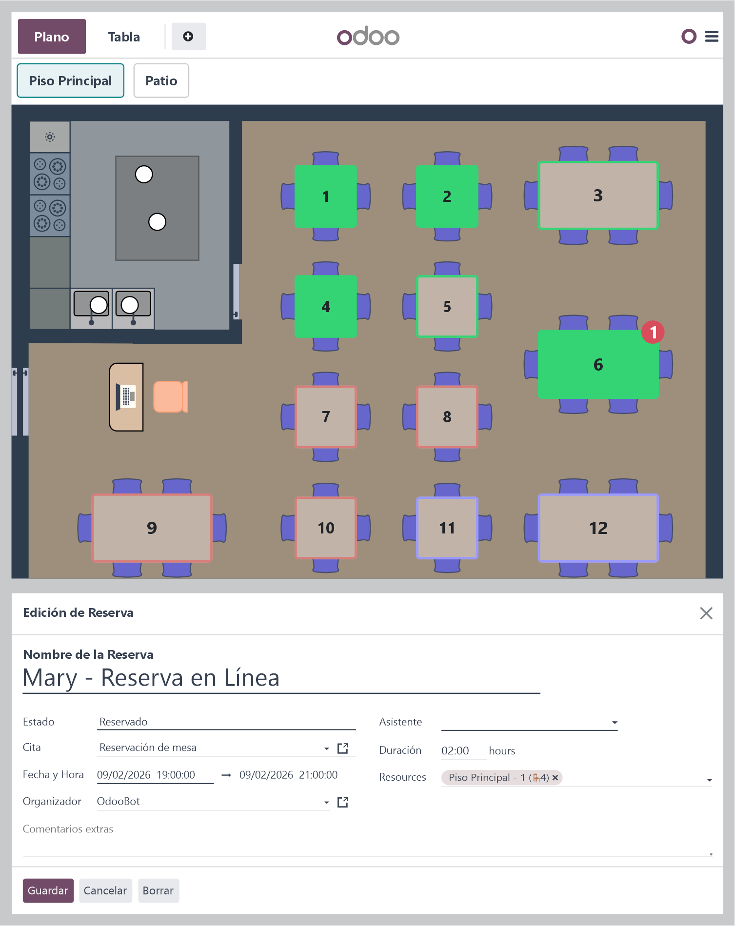 Reservación de mesas en línea. Los clientes pueden reservar mesas en línea con la aplicación Citas de Odoo. Estas mesas aparecerán en un mapa personalizable que puedes editar con facilidad desde el editor gráfico.